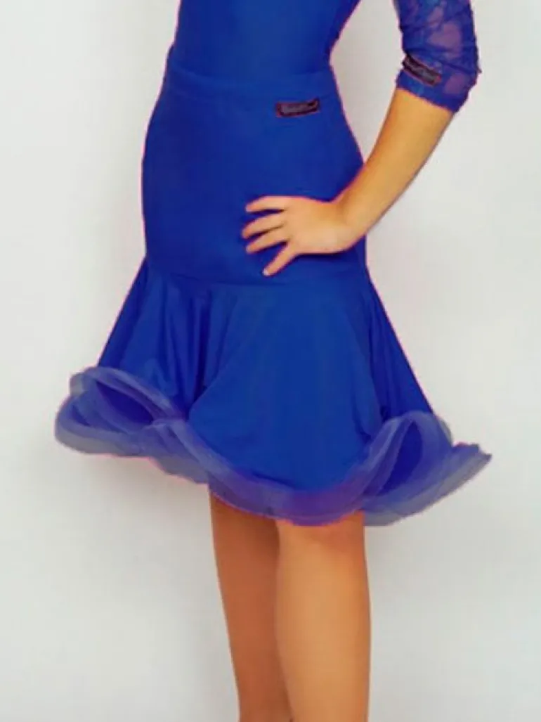 Royal blå nederdel til piger til dans med crinoline bånd i kanten. Elastik i taljen. Super god til danseturneringer. Nederdelen har et virkeligt flot sving. Ready4Dance logo mærke øverst på hoften. Match med royal blå dansebody