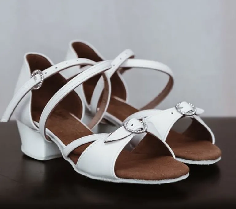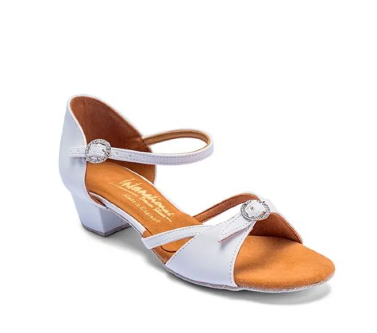 Natasha pige hvid dansesko International er perfekt til piger, der ønsker komfort og stil. Disse sko er lavet af hvidt skind med en 3,5 cm cubansk hæl. Med et flot spænde med sten og en lang rem (som på billede 2), der støtter godt henover foden, er disse regulerbare dansesko velegnede til både smalle, medium og brede fødder.