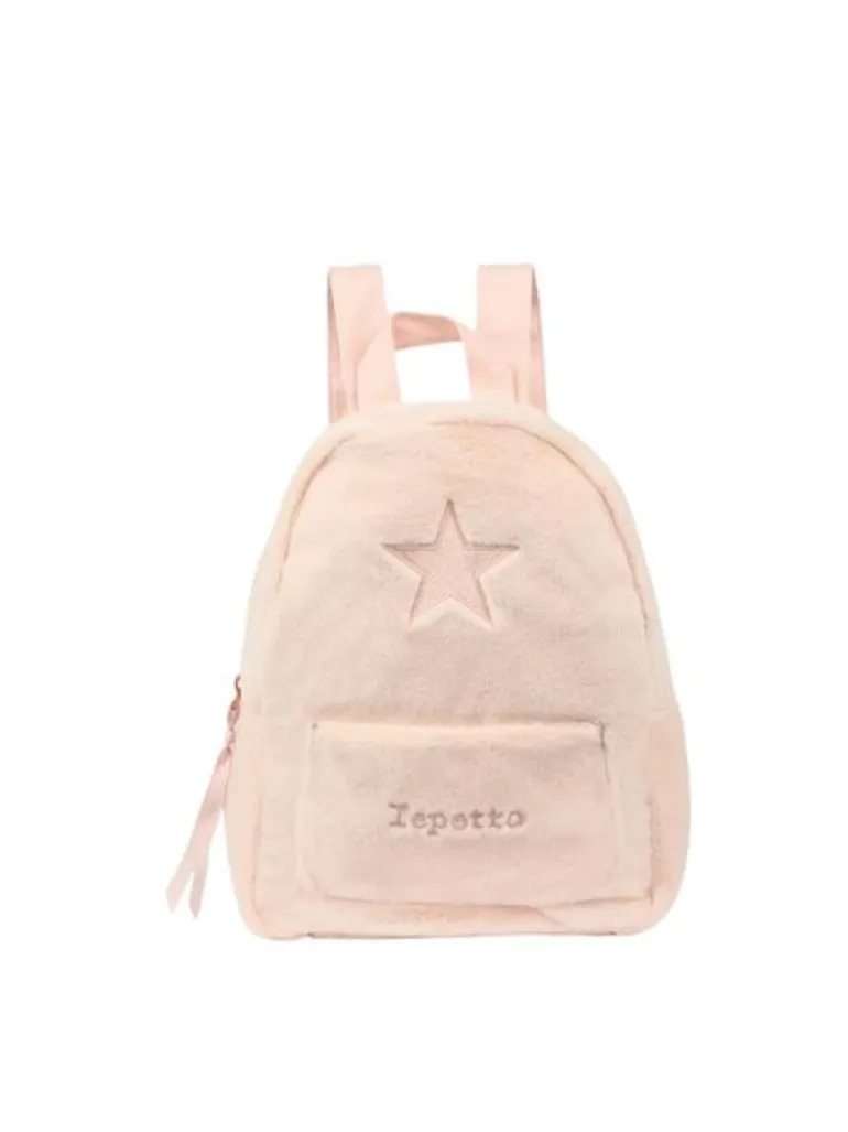 Denne lækre Repetto rygsæk i plys er et must-have til enhver lille danser. Med fine broderede detaljer, lynlåslukning, frontlomme og indvendig lynlåslomme er denne rygsæk både praktisk og stilfuld. Uforet design i kunstpels giver ekstra komfort.