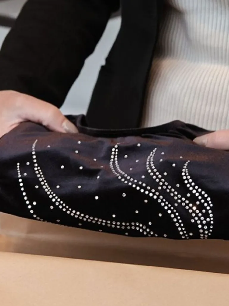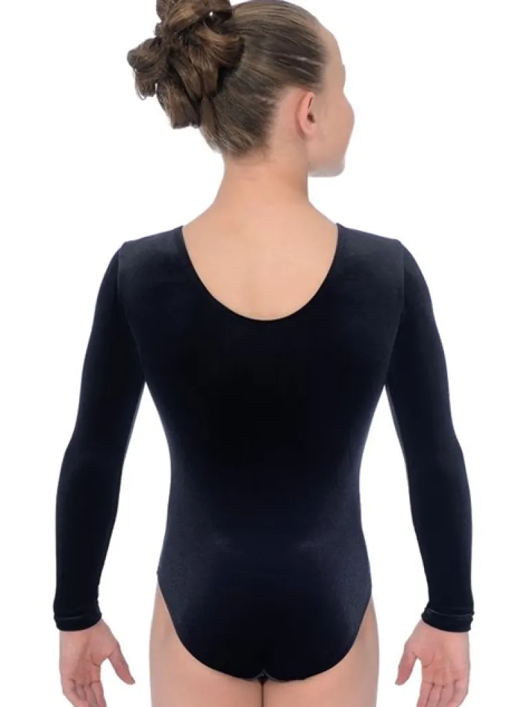 Sort velour gymnastikdragt til piger fra The Zone med lange ærmer. Med masser af sølv rhinsten på fronten. Fremstillet af lækker blød velour bestående af 87% poliamid og 13% lycra elastan. God kvalitet, pasform og populær blandt gymnaster