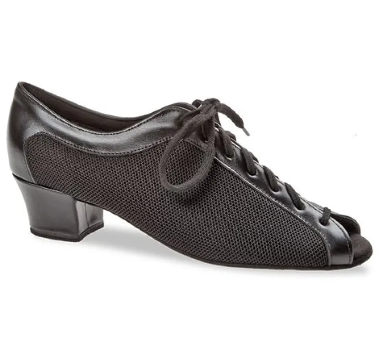 Træningssko fra Diamant med åben tå til damer er håndlavet i Tyskland og er ideelle til træningsdans. Disse flotte sko har en 7-hullers snøring og tilbyder en god pasform og støtte til foden. De kan tilpasses både smallere og bredere fødder. Skoene har en normalbredde, en Diamant Comfort indlægssål og en stabil 3,7 cm cubansk hæl med stor trædeflade. Den italienske premium-kvalitet mikrofiber foring er åndbar og fugtabsorberende. Kombinationen af sort nappalæder og sort mesh giver en stilfuld og blød overdel af højeste kvalitet.