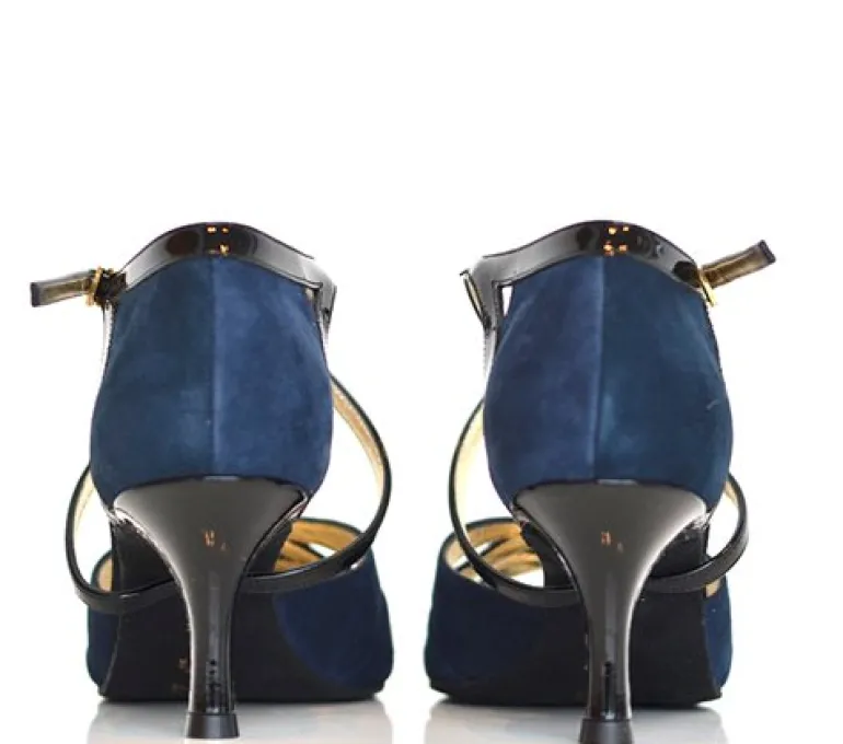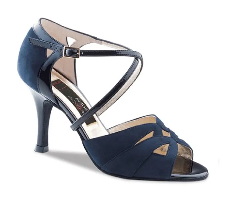 Nueva Epoca by Werner Kern – en af de sofistikerede dansesko i kombination af blåt blødt eksklusivt ruskind med fine og bløde stropper i patent. Den sorte lakstrop er individuelt justerbar og betyder således en behagelig og stabil pasform. 6 cm høj stilet hæl med nikkelfri spænde. Skoen er usædvanligt pasform og yderst komfortabel med en blød og fleksibel foret inder sål. Ekstremt blød og også fleksibel mellemsål af latex. Bredden passer til en normal fod.