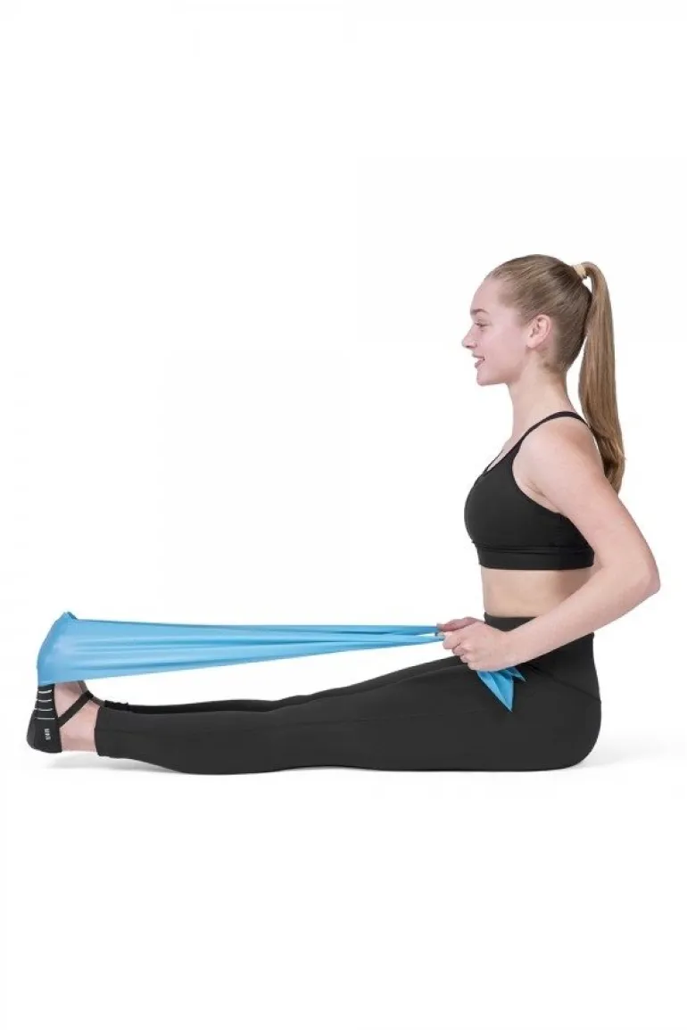 Mens du sidder på gulvet barfodet, holder du enderne af modstandsbåndet i hver hånd