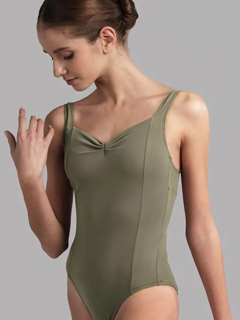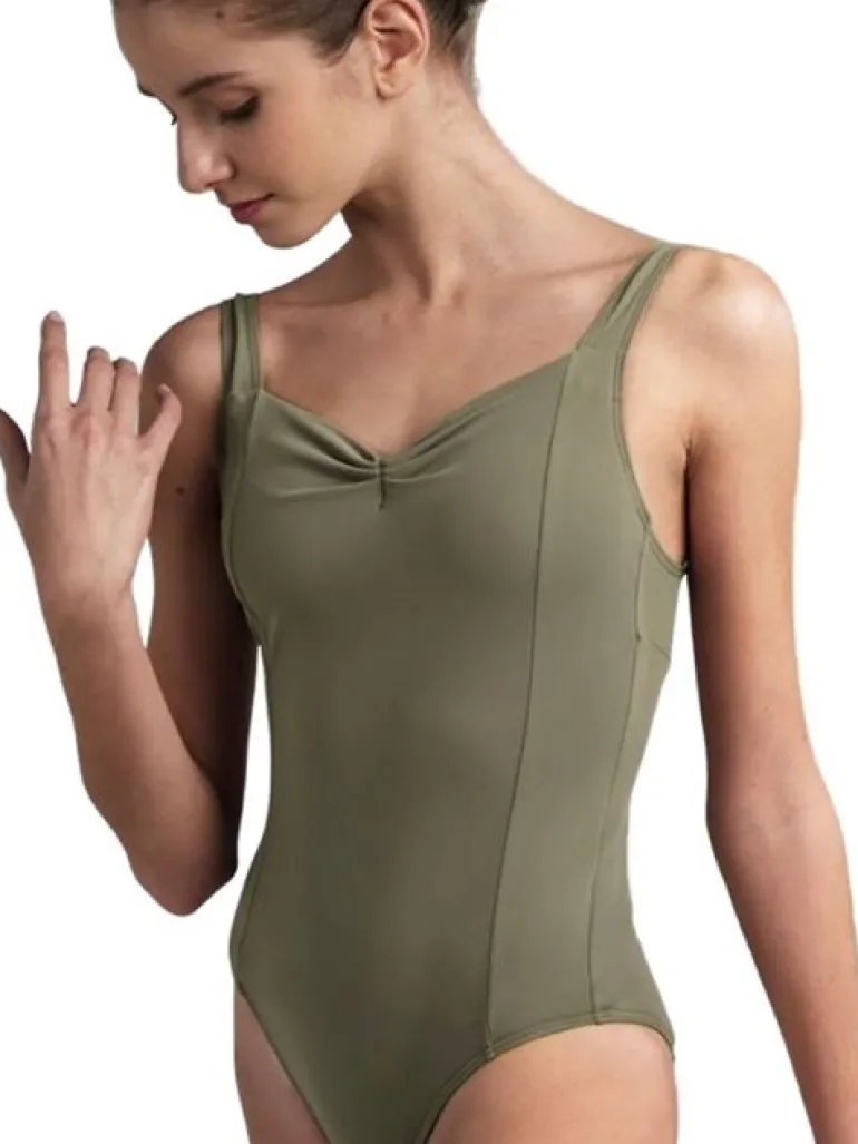 Grishko olivengrøn dragt med virkelig flot rynkedetalje foran og tank stropper. Dragten har prinsesse sømme der er med til at tilføje formning til nøje at følge en kvindes form.
