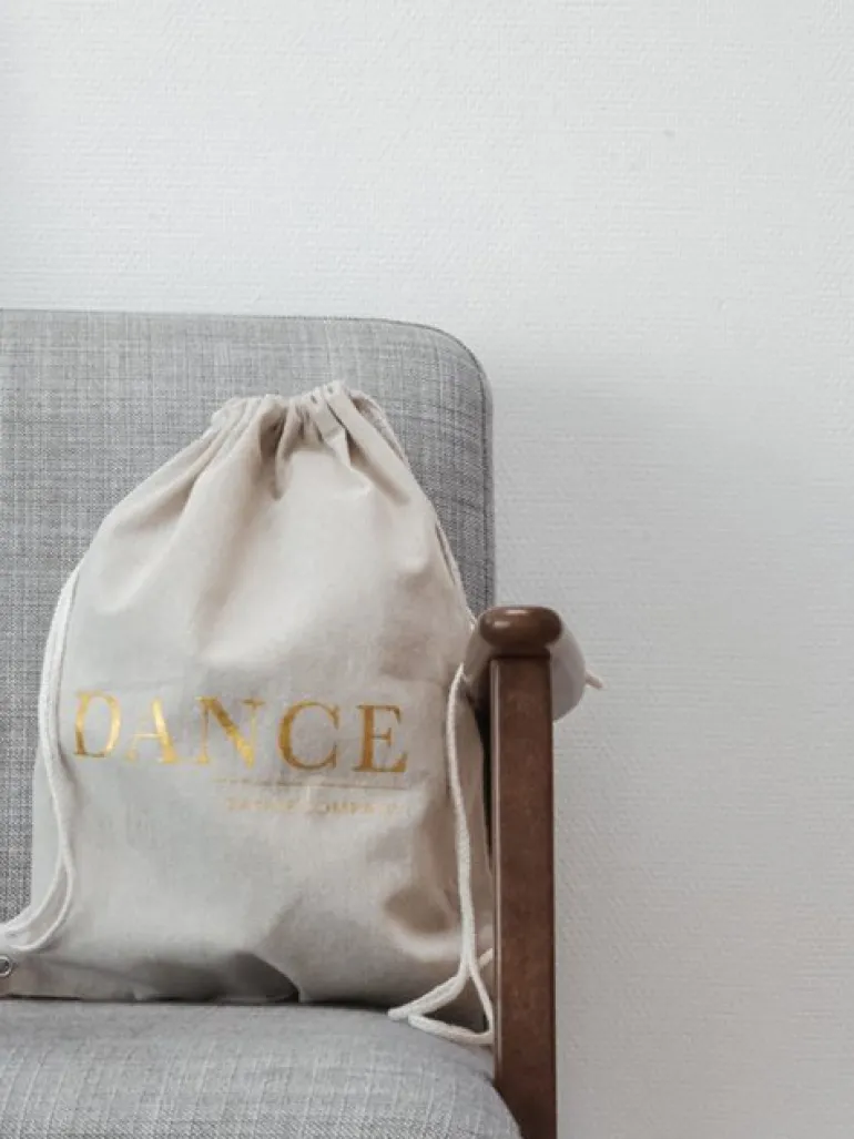 Smuk mulepose i hør med snore så den også kan bruges som rygsæk. Perfekt til dansesko og tøj. Flot guld DANCE tryk.